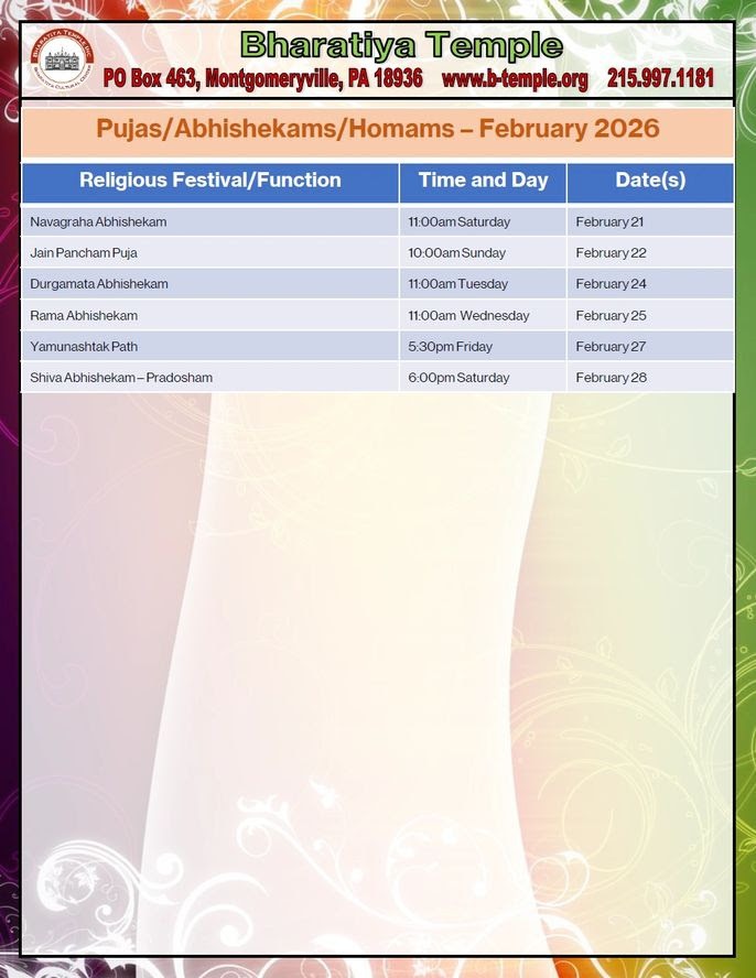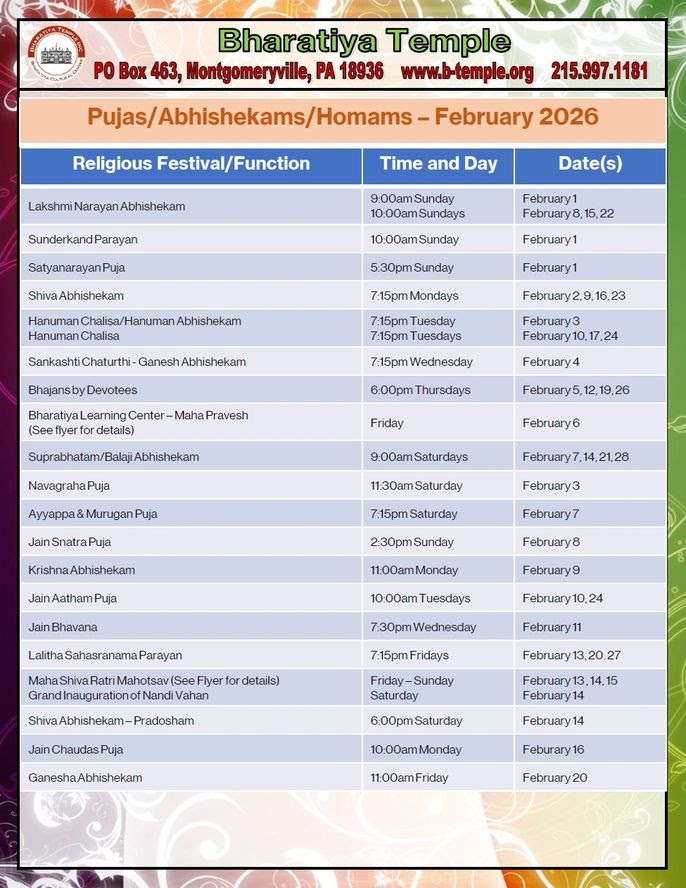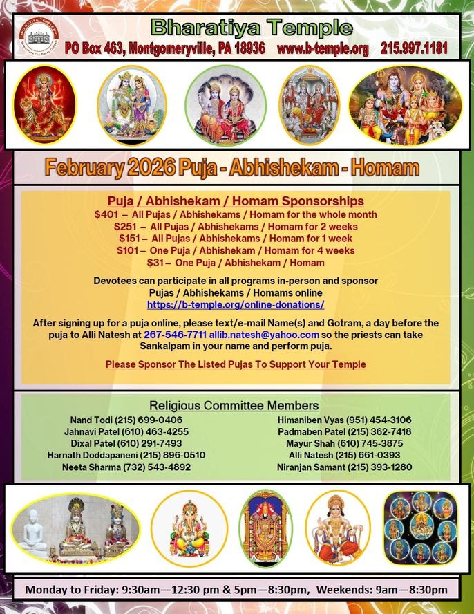 • Temple Hours: Weekdays 9:30 a.m to 12:30 p.m & 5:00 p.m to 8:30 p.m. Weekends: 9:00 a.m to 8:30 p.m.