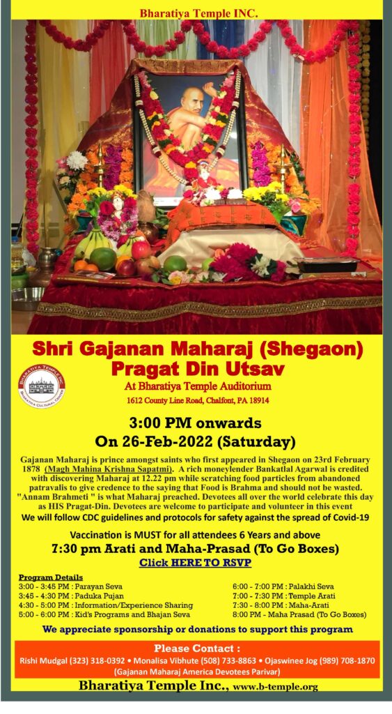 Gajanan Maharaj Pragat Din Feb-26th3:00 p.m - Bharatiya Temple