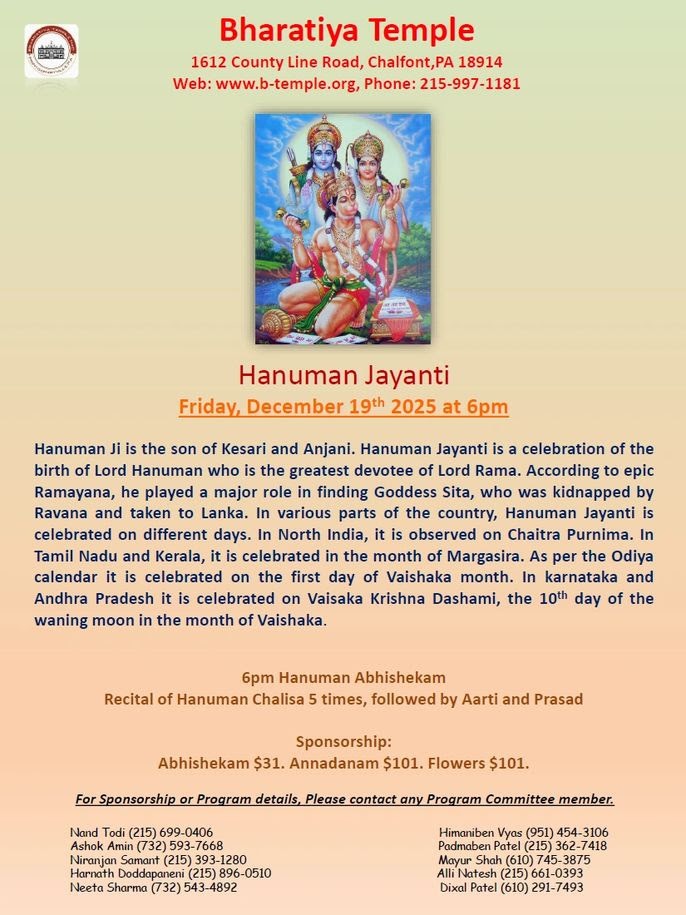 Hanuman JayantiDec-19th6:00 p.m - Bharatiya Temple