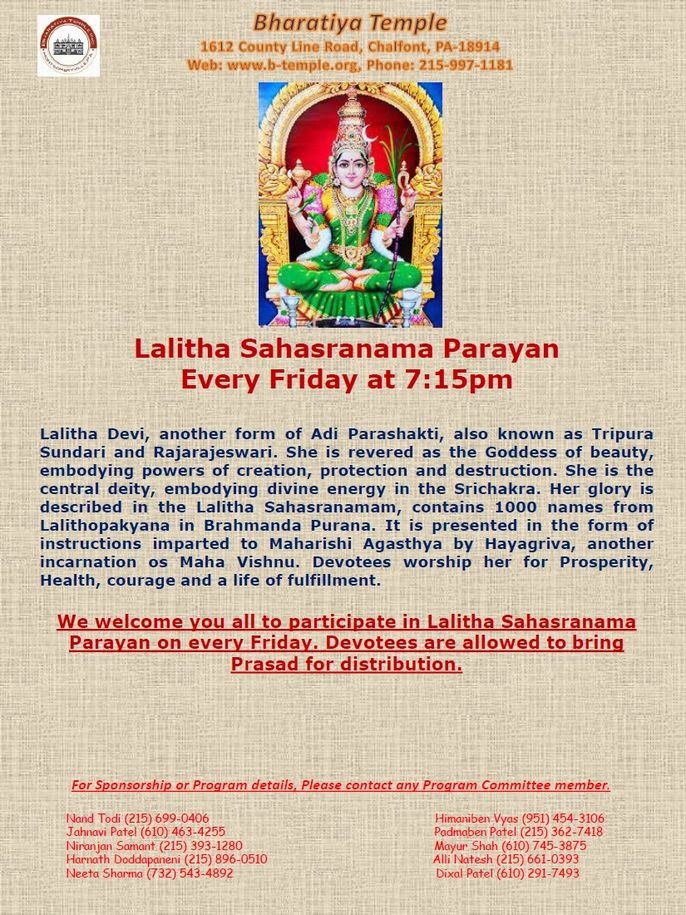 Lalitha SahasranamaEvery Fri7:15 p.m - Bharatiya Temple