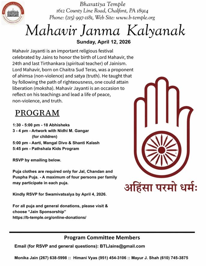 Mahavir Janma KalyanakApril-12th1:30 p.m - Bharatiya Temple