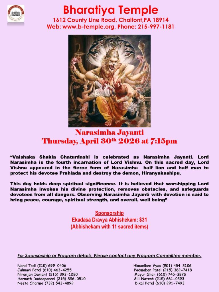 Narasimha JayantiApril-30th7:15 p.m - Bharatiya Temple