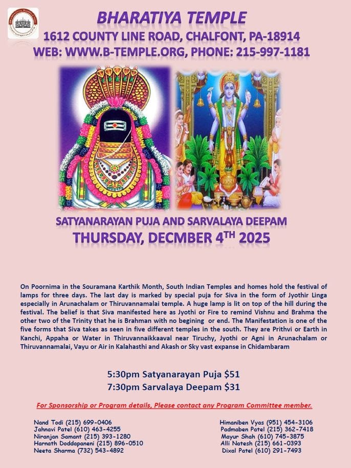 Satyanarayan PujaDec-4th5:30 p.m - Bharatiya Temple