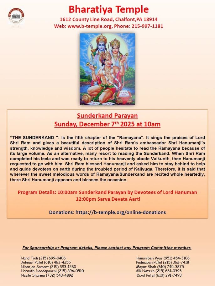 Sunderkand ParayanDec-7th10:00 a.m - Bharatiya Temple